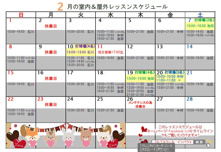 2月の室内&野外レッスンスケジュール