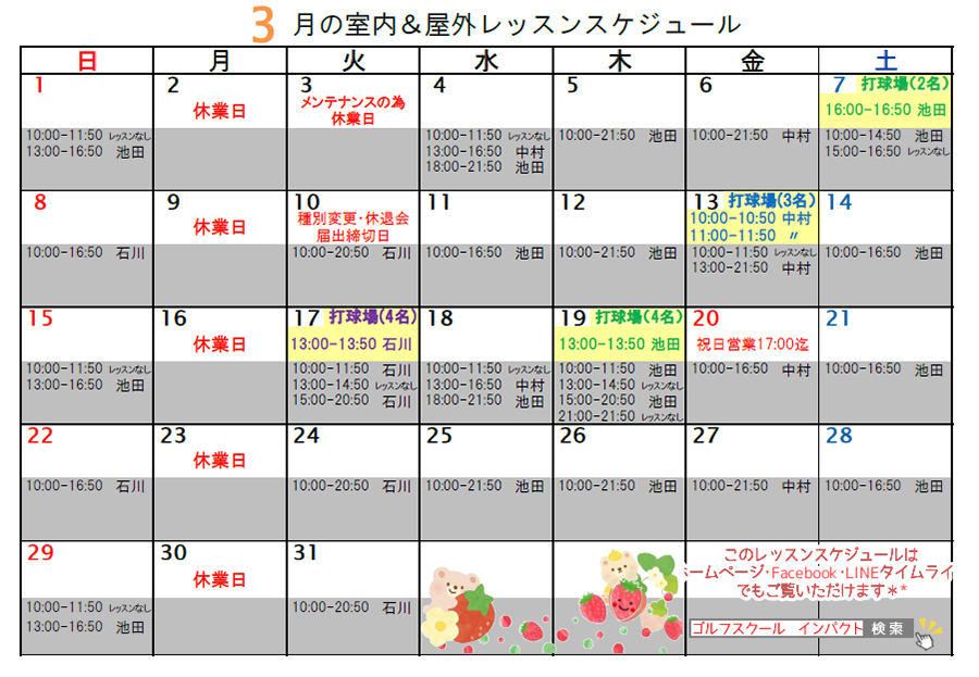 3月の室内&野外レッスンスケジュール